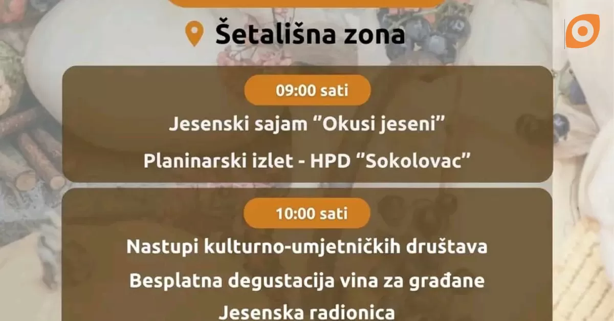 09:00 sati - Jesenski sajam "Okusi jeseni" na kojem će brojni proizvođači i izlagači ponuditi svoje proizvode i rukotvorine.