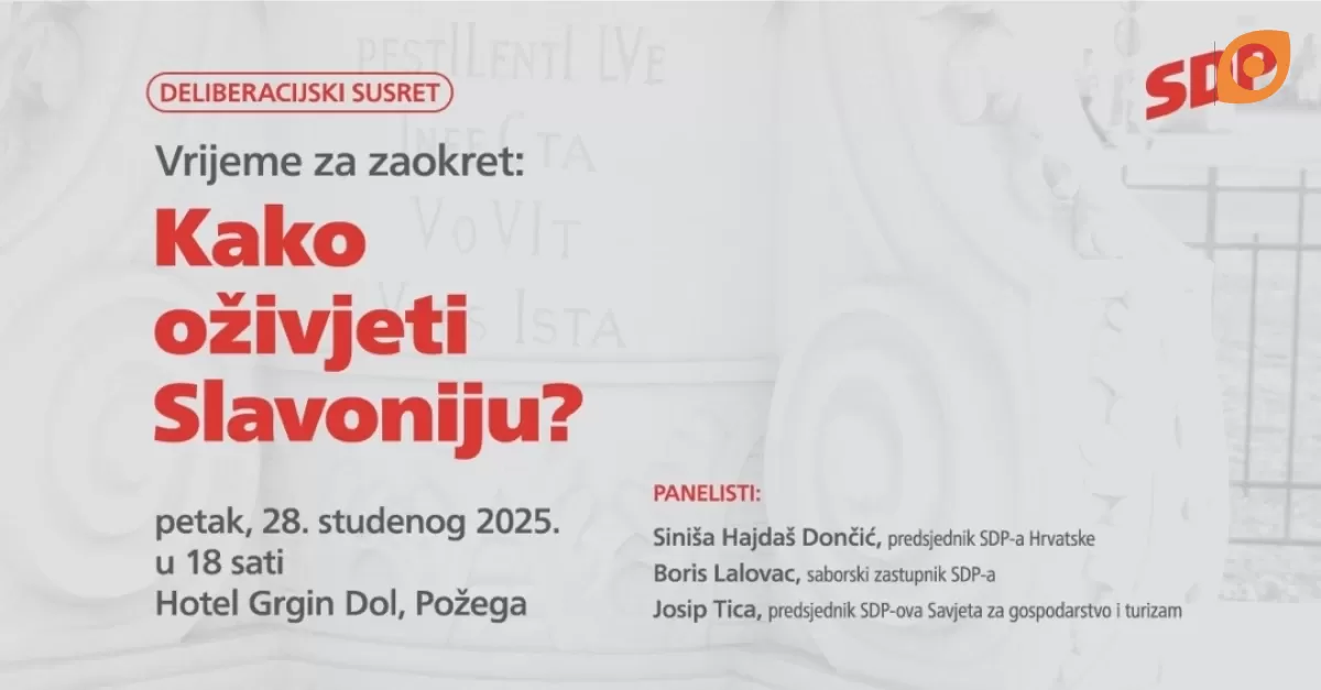 Uvodne govore održat će predsjednik SDP-a Siniša Hajdaš Dončić, zatim Josip Tica, predsjednik SDP-ova Savjeta za gospodarski razvoj i turizam, te SDP-ov saborski zastupnik Boris Lalovac. Njihova izlaganja bit će polazište za panel raspravu u kojoj će se rasvijetliti ključna pitanja razvoja Slavonije, demografske revitalizacije te poticanja gospodarstva u zapostavljenim dijelovima Hrvatske.